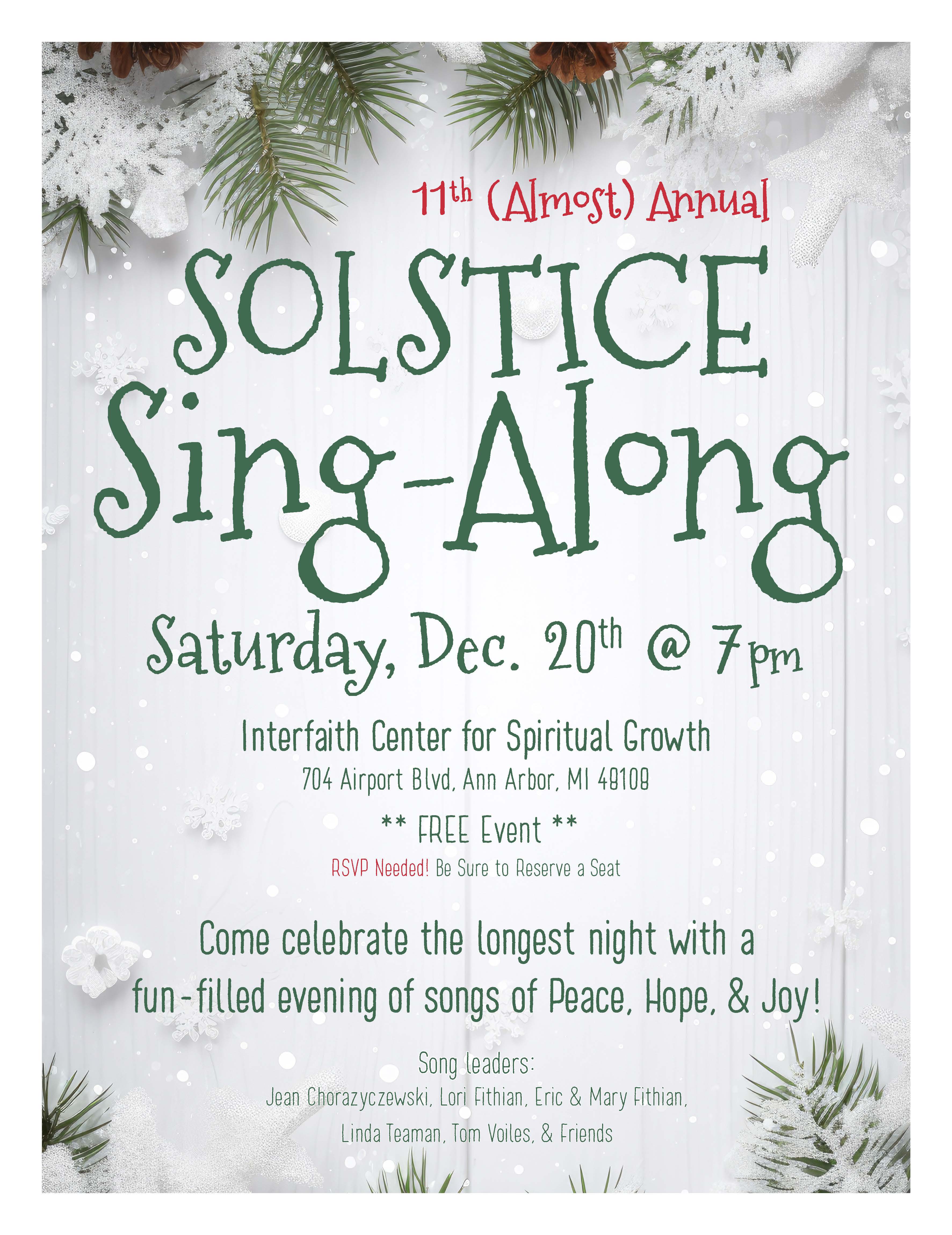 - Saturday, December 20: Solstice Sing, 7 pm – reserve a spot at