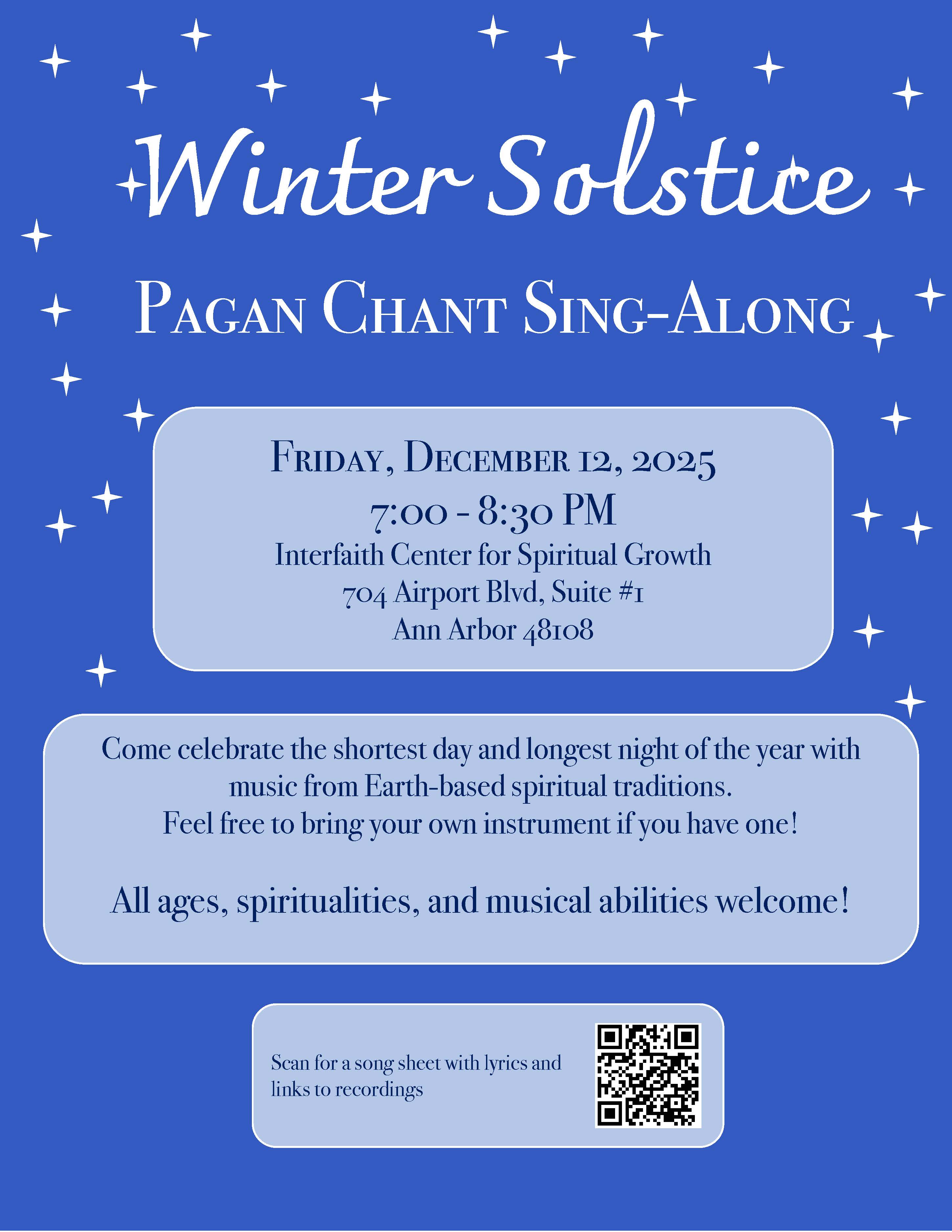 - Friday, December 12: Soltice Pagan Songs Sing-Along, 7-8:30