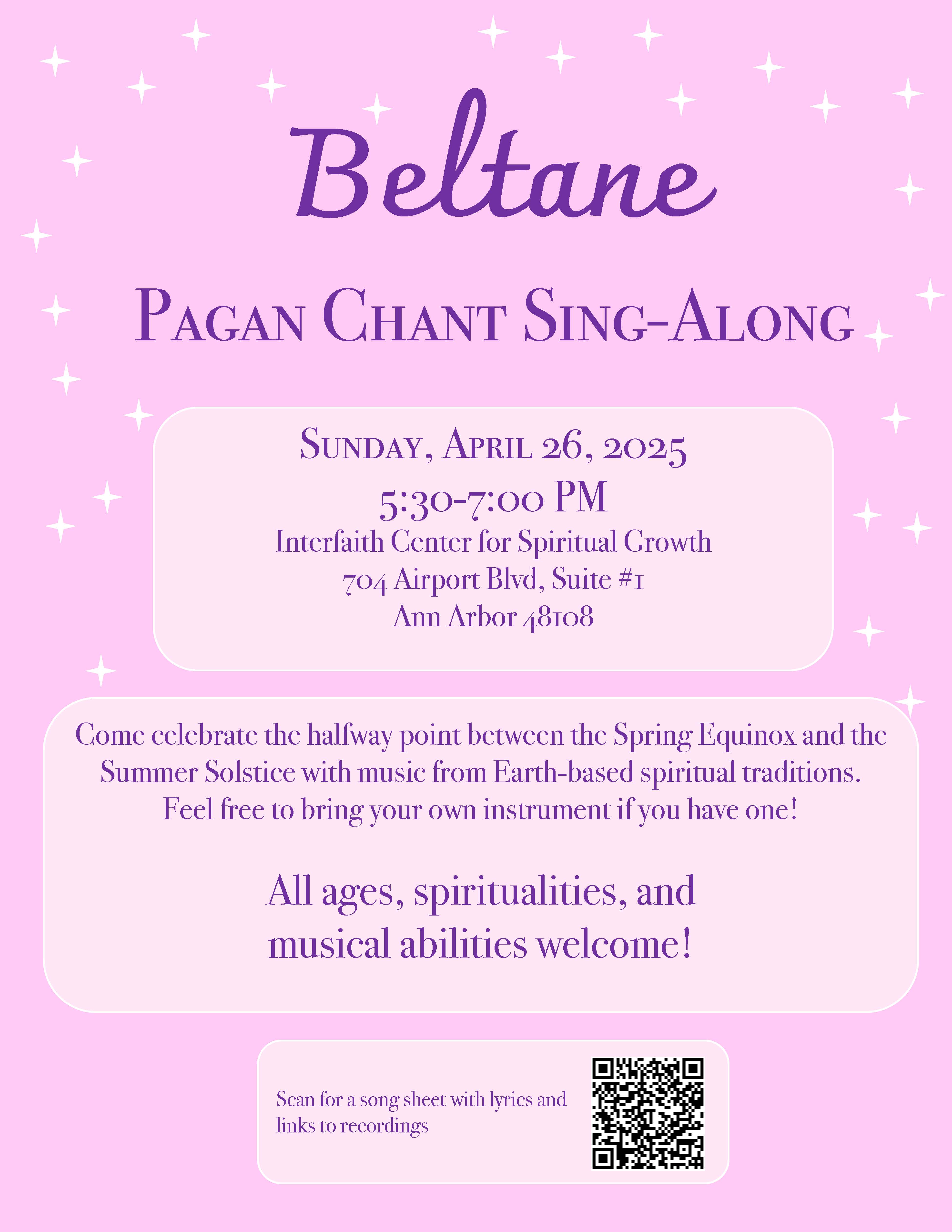 Special Events Click to enlarge fliers. Click again to enlarge them more! Meditation Retreat Beltane Chant Sing-Along Jewish Mysticism Class Download flier